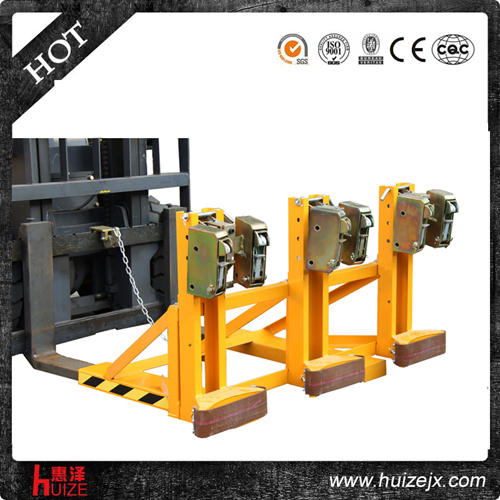 重型三油桶夾具單鷹嘴純機械機構設計可與叉車方便地配合,僅依靠叉車的動作,不需要其它的動力,可自動一次搬運3個塑料油桶, 配置可拆換式柔性耐磨保護墊,有效保護油桶并緩沖叉車行駛過程中的震動, 能在集裝箱等這樣狹小的環(huán)境內裝卸桶裝物質,可極大地提高空間利用率, 與貨叉連接配有自鎖裝置確保油桶夾在坡度上和顛簸路面使用時不會滑落.